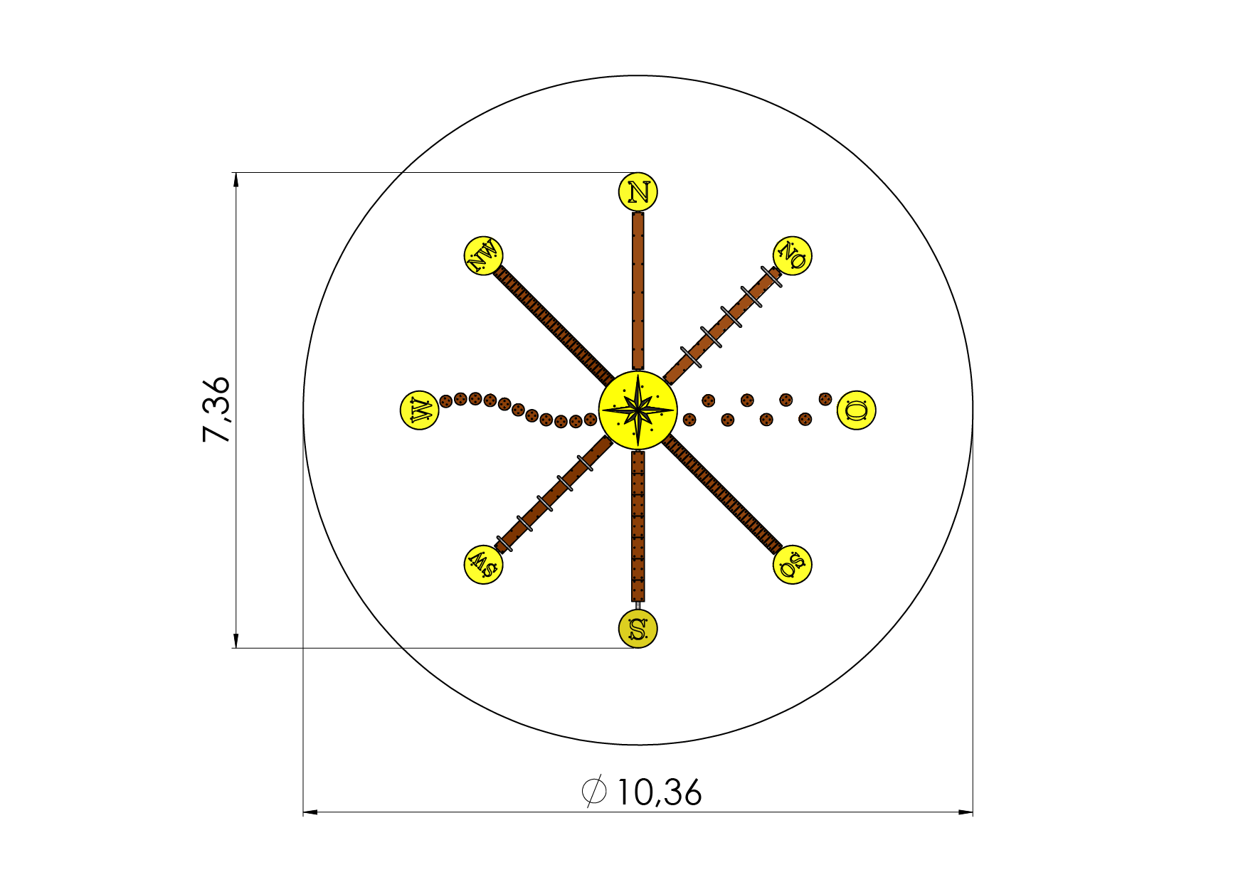 On the COMPASS balancing equipment, children can practice coordination and balance while also learning cardinal directions. An initial denoting a direction is carved into the first plate of each track. There are 8 different balance and crawling tracks to pass through. Each balance track is installed in the direction of the corresponding cardinal direction.
