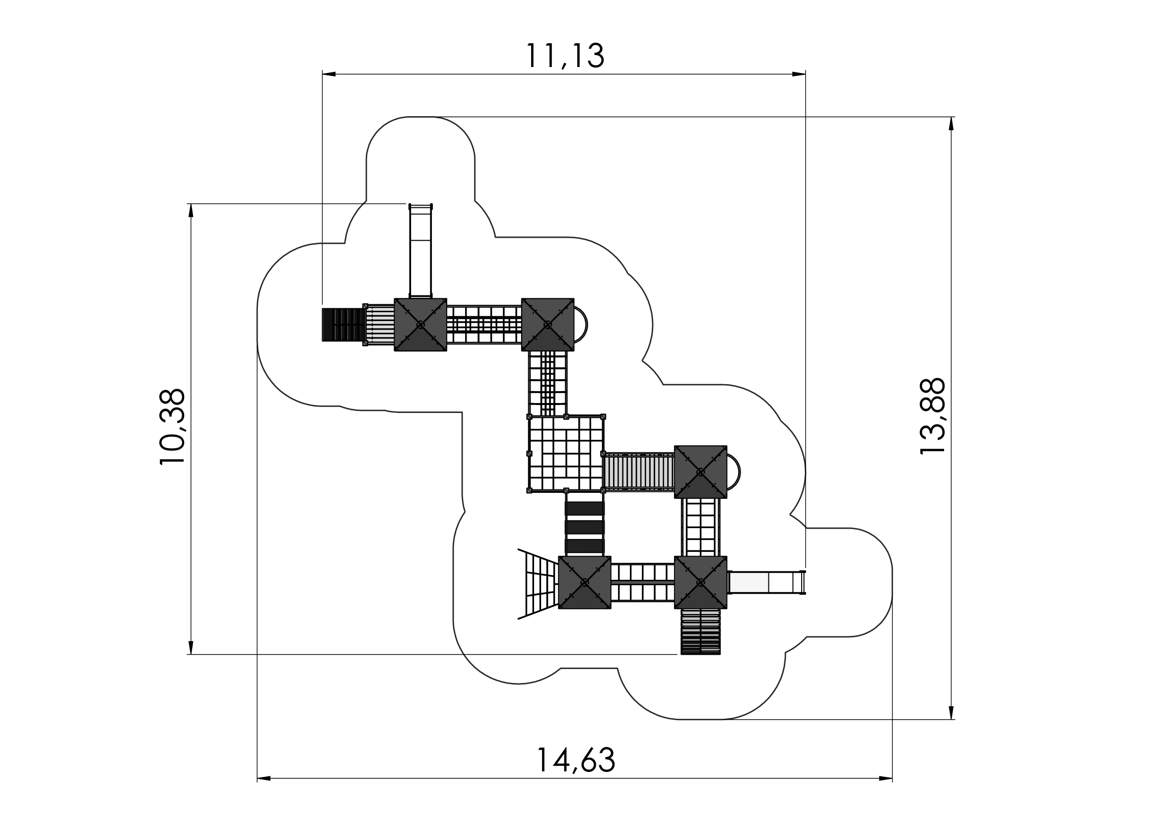 A fun and versatile multi activity centre with six platforms, a bridge with moving steps, a sloping bridge, a net tunnel, a bridge with a suspended walkway, an arched path, ladders and net bridges with handrails. Two firemans poles and two slides offer sliding opportunities. The side panels of the multi activity centre can be switched for various activity walls or thematic printed panels (animals, birds, fish, trees, berries, etc.). The design of the panels will be finalised with the client during ordering.