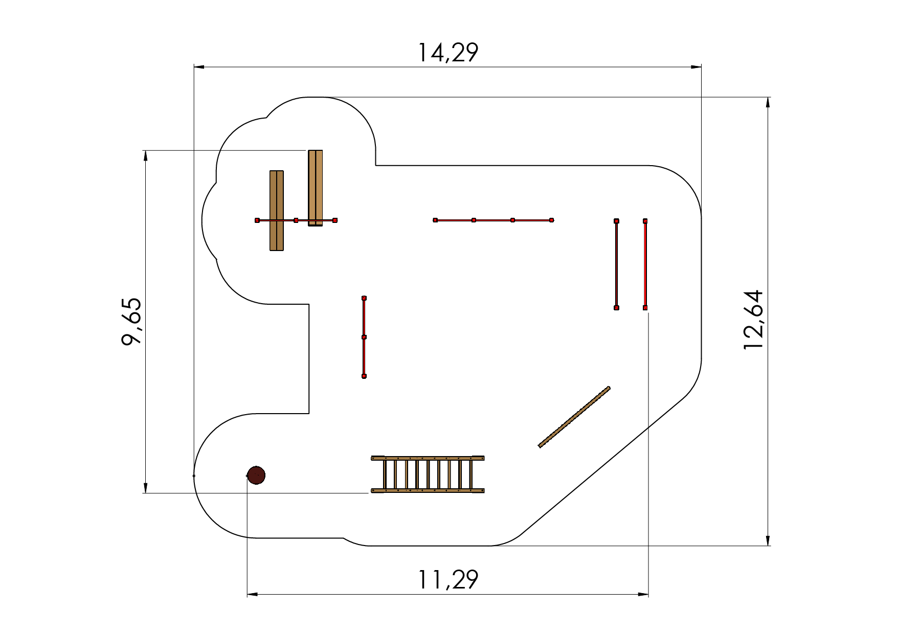 The outdoor exercise complex includes an abdominal training device, dual hang bars, parallel bars, a beam, a balance bridge with moving steps, push-up bars and a spring plate.