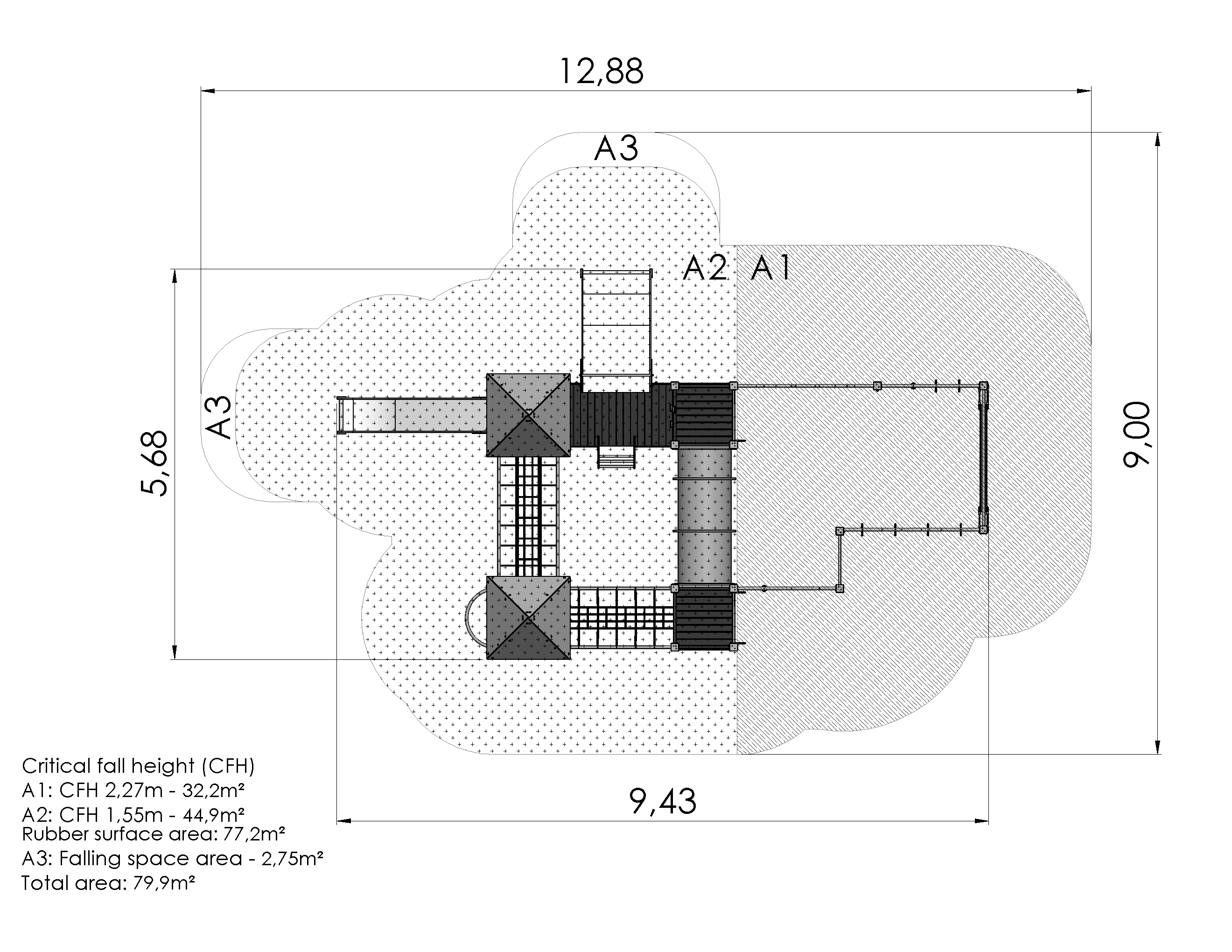 This engaging and versatile climbing and play centre provides a selection of diverse elements for many different activities. The five platforms can be accessed via ladders or climbing walls with holes. A net bridge, a crawl tunnel and a sloping bridge with handrails connect the platforms. A slide and a firemans pole offer excellent sliding opportunities. An adjoined climbing complex, comprised of a net wall, climbing ropes, monkey bars with handles, a shifting balancing beam, and a vertical ladder, helps develop climbing and dexterity skills. For role playing, the centre is equipped with a Tic-Tac-Toe game and a fun play corner with a bench, which can be fitted with either kitchen or car dashboard elements. The side panels of the play centre can be switched for various activity walls or thematic printed panels (animals, birds, fish, trees, berries, etc.). The design of the panels will be finalised with the client during ordering.