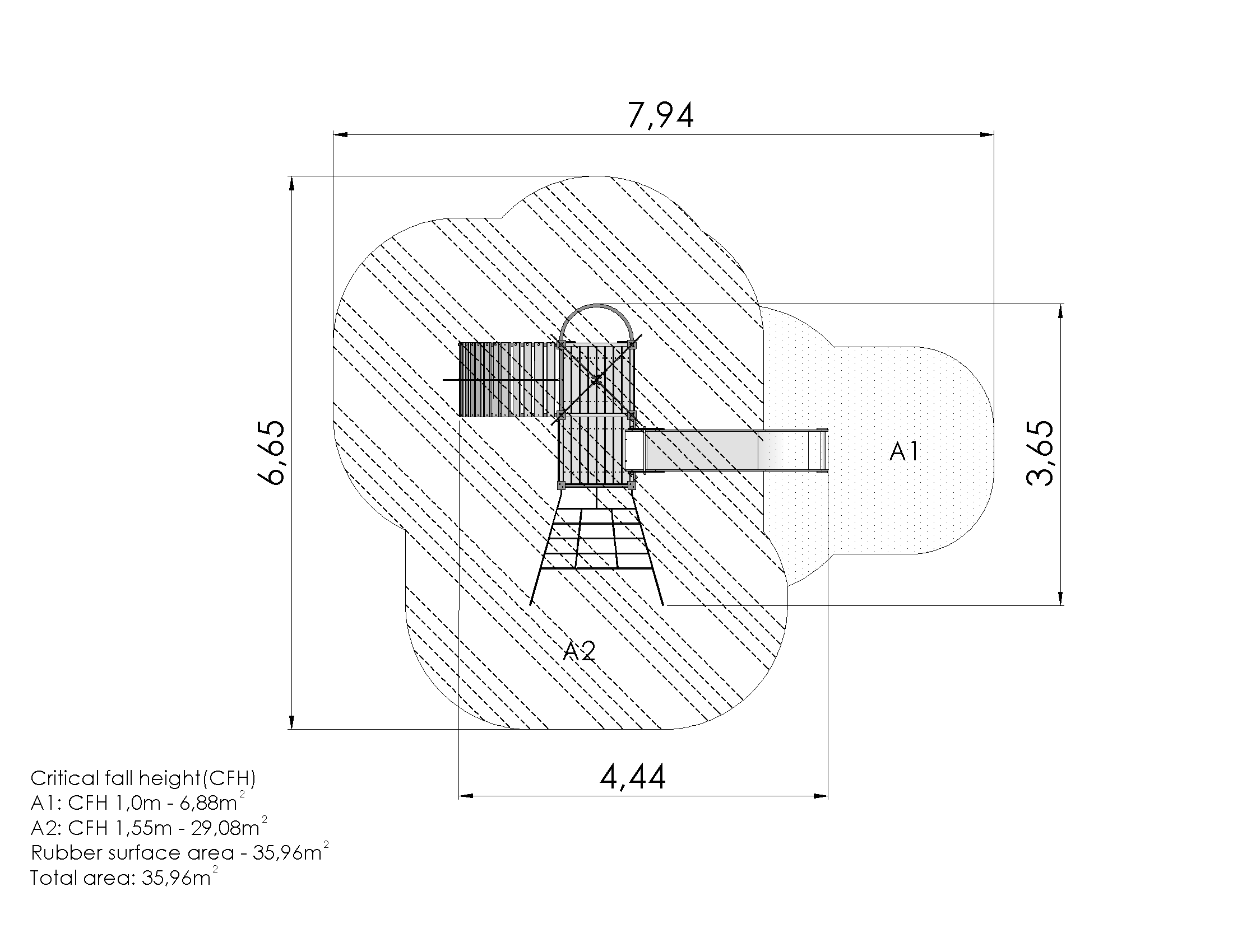 Play centre with two platforms, accessed via an arched path or a net slope. A slide a the firemans pole offer a way to slide down. The side panels of the play centre can be switched for various activity walls or thematic printed panels (animals, birds, fish, trees, berries, etc.). The design of the panels will be finalised with the client during ordering.