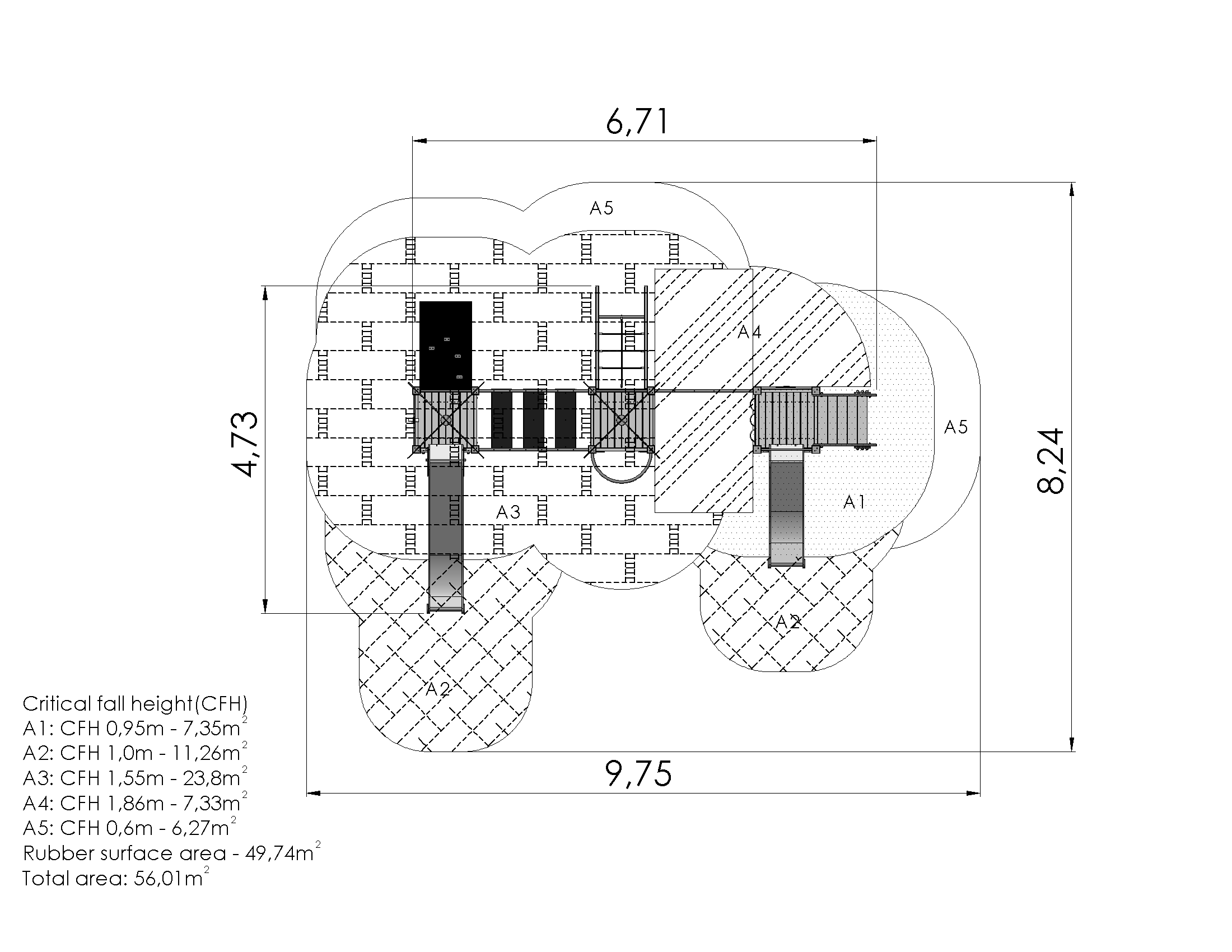 This play centre with three platforms, two slides and several climbing elements is suitable for creative play and exploration. Stairs with handrails lead to the lower platform that contains a Tic-Tac-Toe game, a clock panel and a slide. A rock climbing wall or a net sloping wall lead to the higher platforms. The highest platforms are connected by a balance bridge with handrails and moving steps. From the higher platforms, a slide and a firemans pole offer a way for reaching the ground. Two different climbing walls offer a way to test ones strength. A fun play corner with a bench can be fitted with either kitchen or car dashboard elements. The side panels of the play centre can be switched for various activity walls or thematic printed panels.