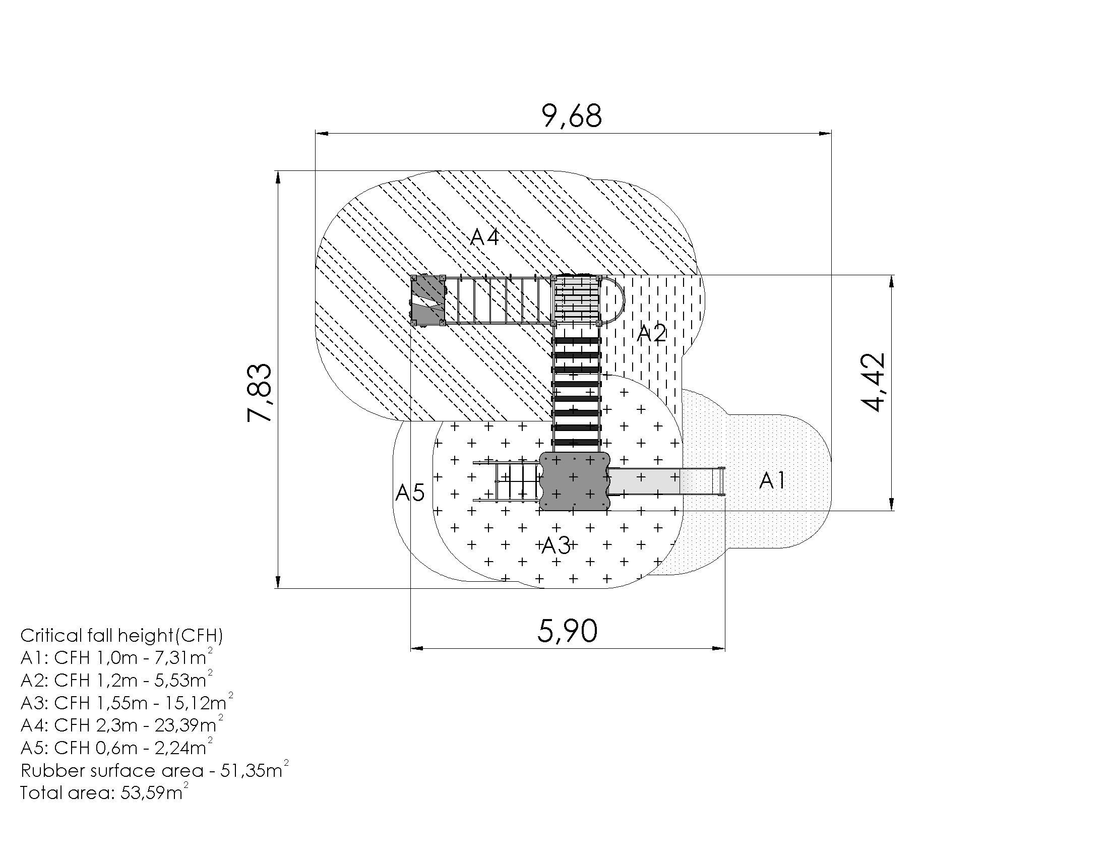 This play centre with its two platforms, a slide and several climbing elements is well suited for diverse activities. The platforms can be reached via a ladder or a net slope and they are connected by a balance bridge with moving steps. A firemans pole and a slide offer a way down from the platforms. A small play corner and a clock panel add an extra layer of fun. Six different climbing walls, a net wall and horizontal ladder with helpful handholds offer to test the kids dexterity and strength. The side panels of the play centre can be switched for various activity walls or thematic printed panels (animals, birds, fish, trees, berries, etc.). The design of the panels will be finalised with the client during ordering.