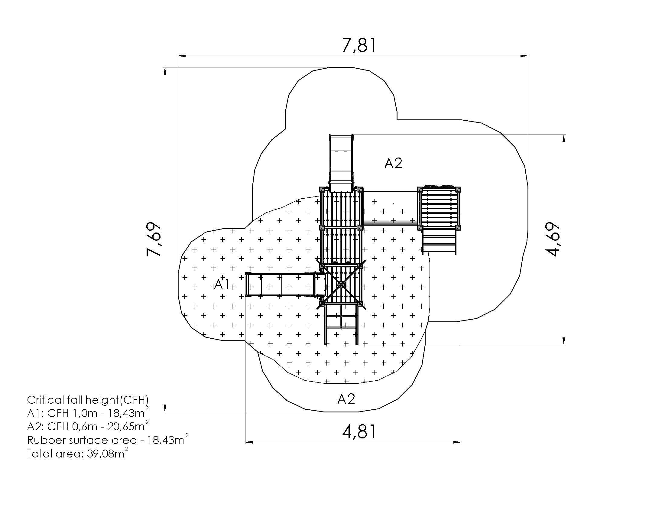 A play centre with four platforms, a tunnel and two slides. Stairs with handrails lead to the lower platform, which is equipped with an activity panel. A crawl tunnel leads to the next platform where a slide offers a way down. A sloping net bridge leads to the higher platform with a roof, where the other slide provides a way down. The side panels of the play centre can be switched for various activity walls or thematic printed panels (animals, birds, fish, trees, berries, etc.). The design of the panels will be finalised with the client during ordering.