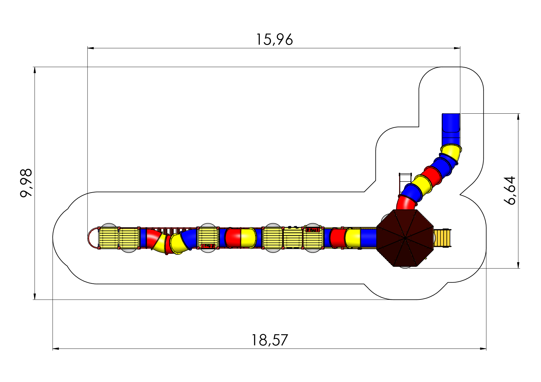 Two-tiered play centre with five platforms and a large castle tower is fully suited for developmental play and offers activities for children of various age groups. The lower tier is created for toddlers and contains many elements that help develop their physical and motor skills. Stairs with handrails lead to the lower platform. To move on a balance bridge with moving steps, a net bridge, a sloping bridge or a rock climbing wall have to be crossed. The path is lined with moving and rotating activity walls, a clock, binoculars and several fine motor skills panels. A small and sturdy slide offers a way down. The platforms, tunnels and portholes for older children are housed on the higher tier and can be accessed via a ladder or a climbing wall with holes. The big, roofed platform offers two ways for sliding down: a tunnel slide or a firemans pole. Activity walls offer an abundance of fun activities and an extra level of joy. The two floors of the castle tower are connected by a rope climbing element, which provides a challenging climb between the two levels.