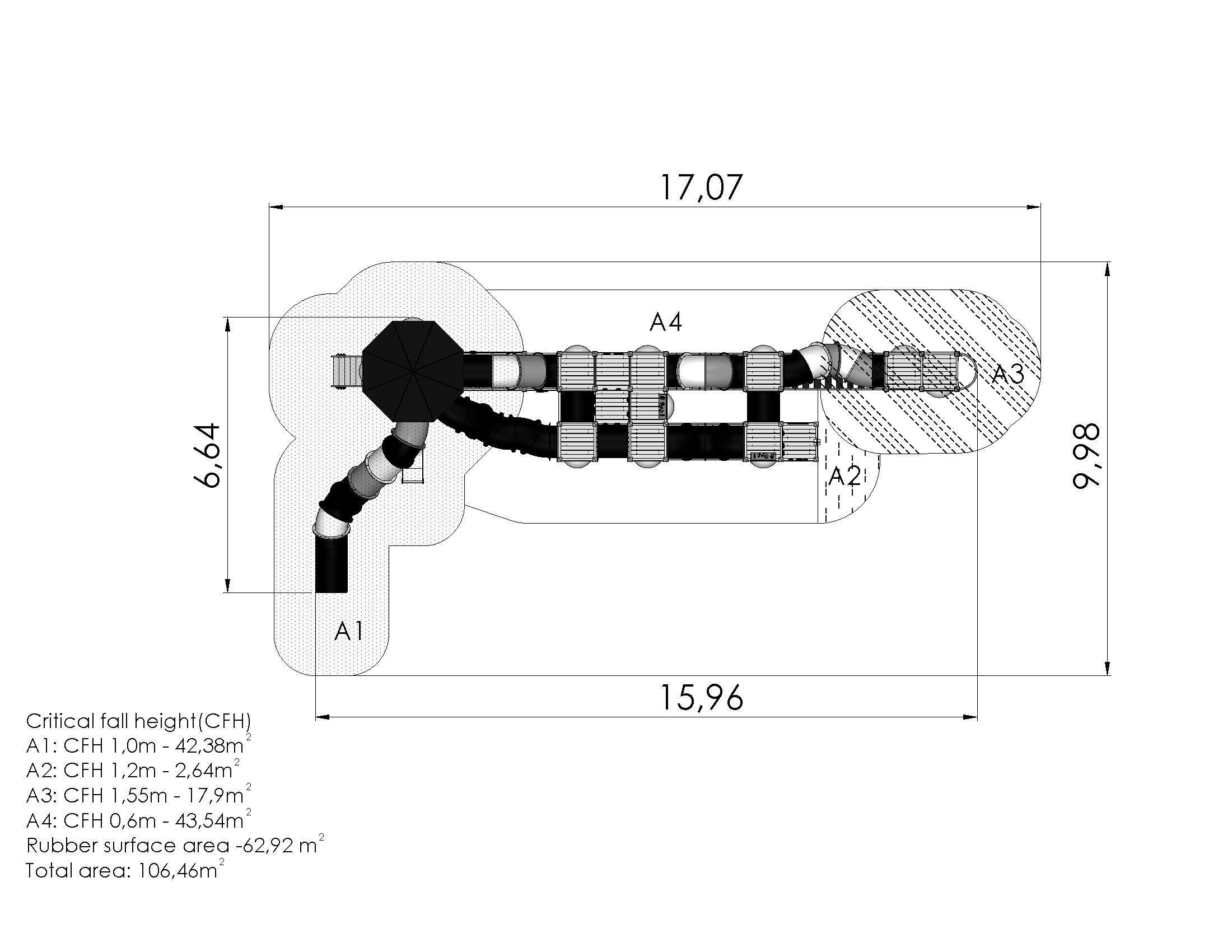 A two-tiered play centre with a large castle tower and activity elements is fully suited for developmental play and offers activities for children of various age groups. Stairs with handrails, ladders, climbing walls and platforms offer access to the play centre. The lower tier is created for toddlers and contains an abundance of elements that help develop their physical and motor skills. Stairs with handrails lead to the lower platform. To move on a balance bridge with moving steps, a net bridge, a sloping bridge or rock climbing wall have to be crossed. The lower play area is lined with moving and rotating activity walls, a clock, binoculars and several fine motor skills panels. A small and sturdy slide offers a way down. The playground for older children with its several platforms, tunnels, climbing walls and portholes is housed on the higher tier. The big, roofed platform offers two ways for sliding down: a tunnel slide or a firemans pole. The two floors of the castle tower are connected by a rope climbing element, which provides a challenging climb between the two levels. The lower level houses a fun play corner with a bench and either kitchen or car dashboard elements.