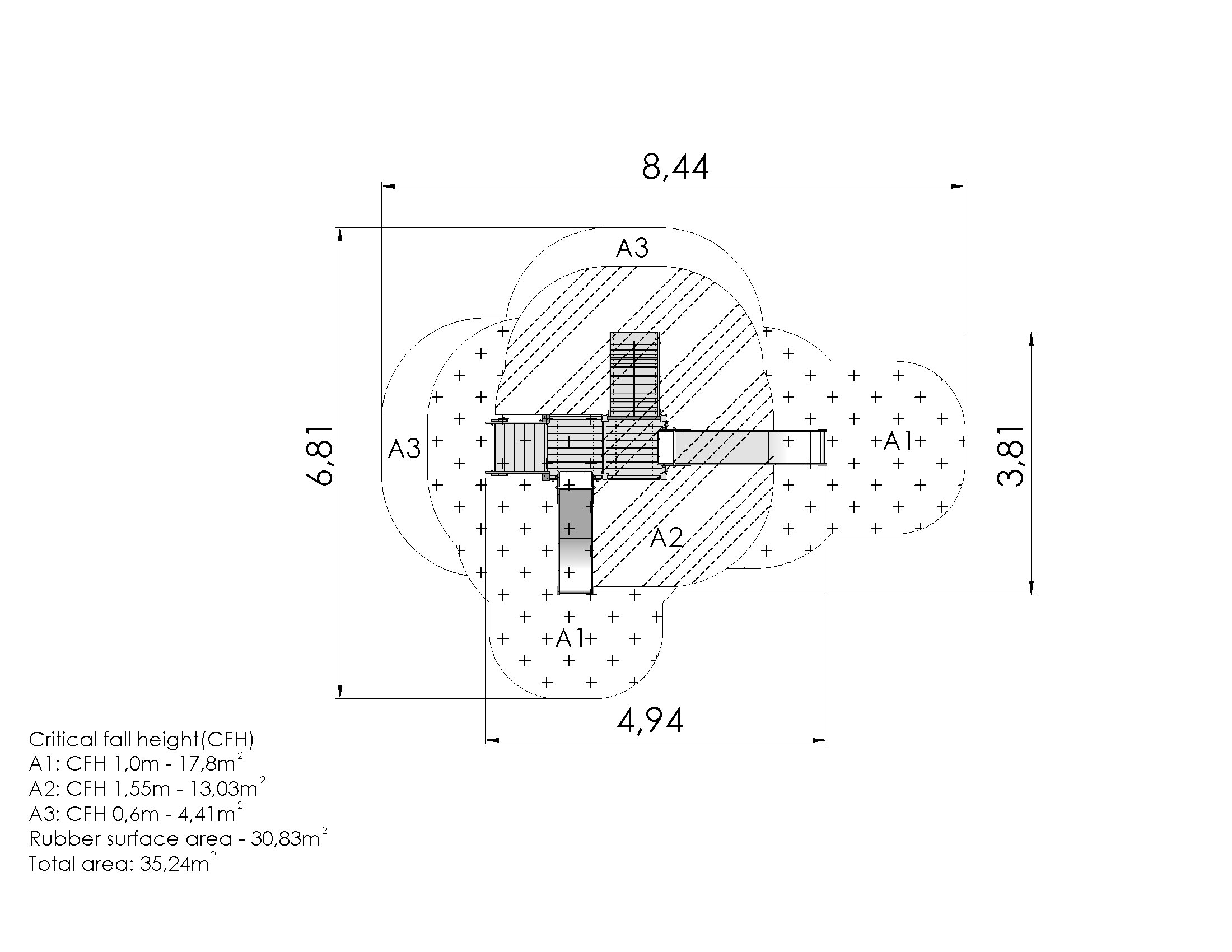 A play centre with platforms at two levels, a ramp with rungs, stairs with handrails and two slides. The higher platform is equipped with an abacus for role playing activities. The side panels of the play centre can be switched for various activity walls or thematic printed panels (animals, birds, fish, trees, berries, etc.). The design of the panels will be finalised with the client during ordering.