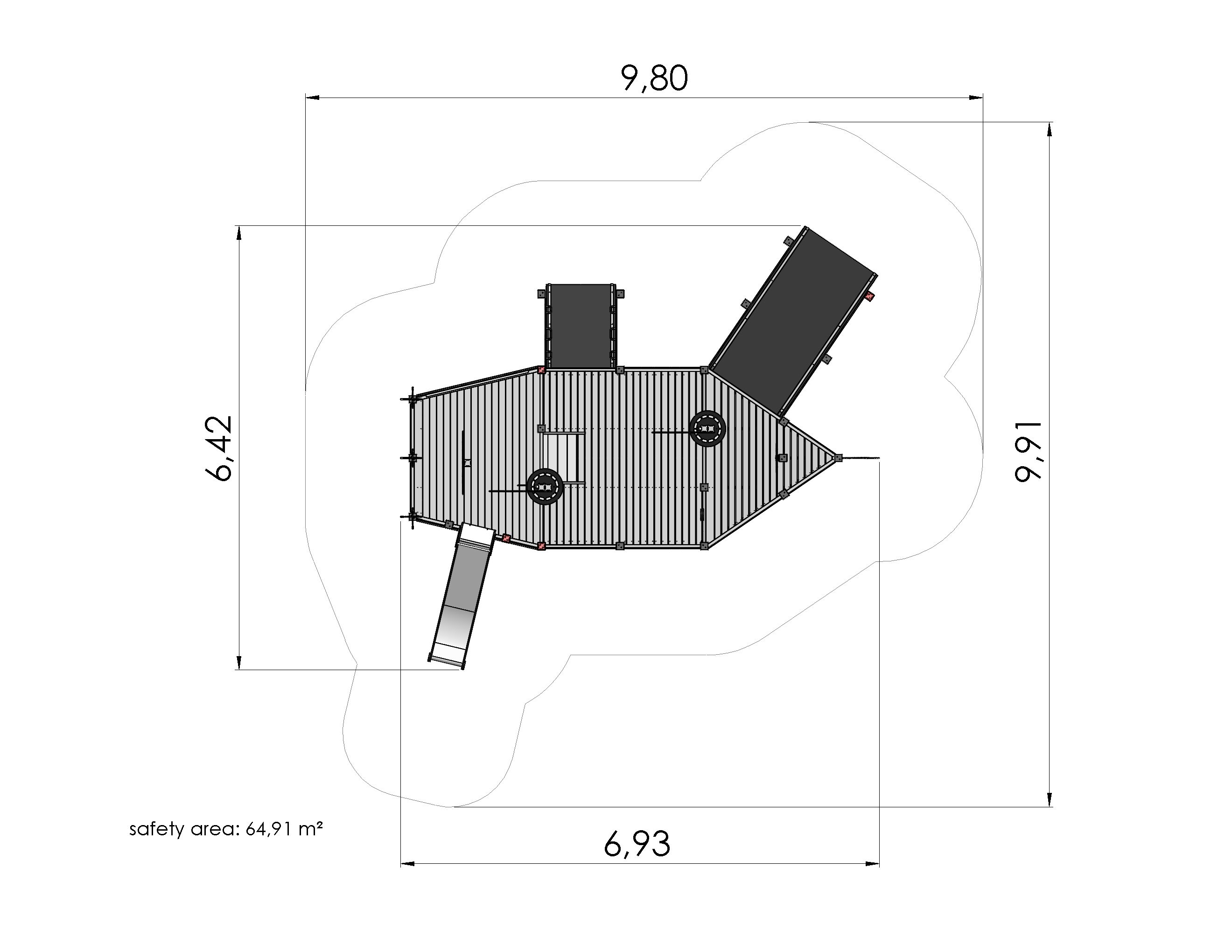 This lovely wooden sailing ship GUSTAV VASA is suitable for small children. The product can also be used by children with special needs. The ship has three platforms with heights of 0.45 m, 0.9 m and 1.2 m. You can use the ramps and stairs to reach different platforms. The highest platform has the captain's steering wheel and a slide; there is a sandbox under the platform. For an additional fee, the product's standard panels can be replaced with activity panels.