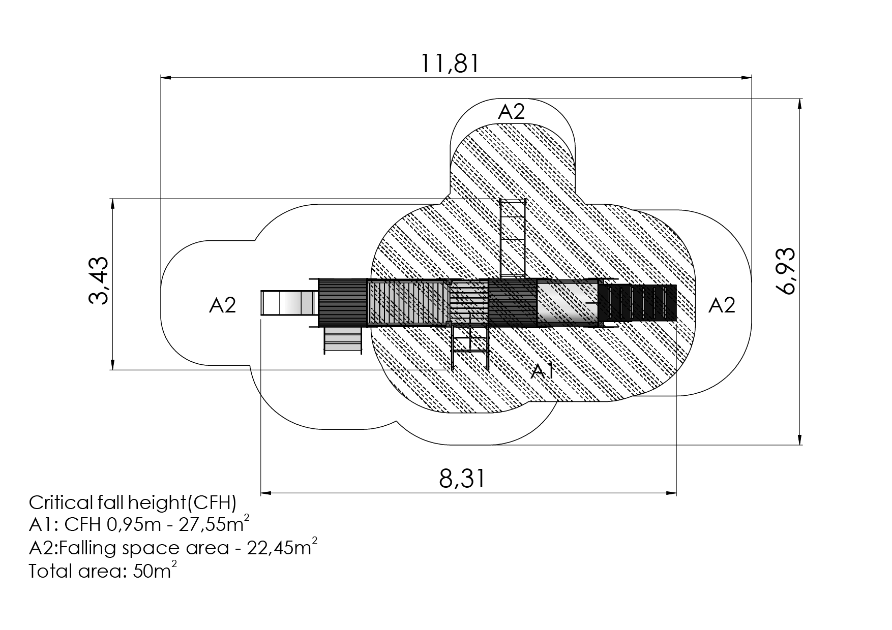 A lovely playtrain suitable for small children. The train has 2 slides with heights of 0.55 and 0.95 m, a long wooden bridge, a crawl tunnel and an abacus. To reach the upper platform, children can walk up the stairs and use the ramp with net or wooden steps.