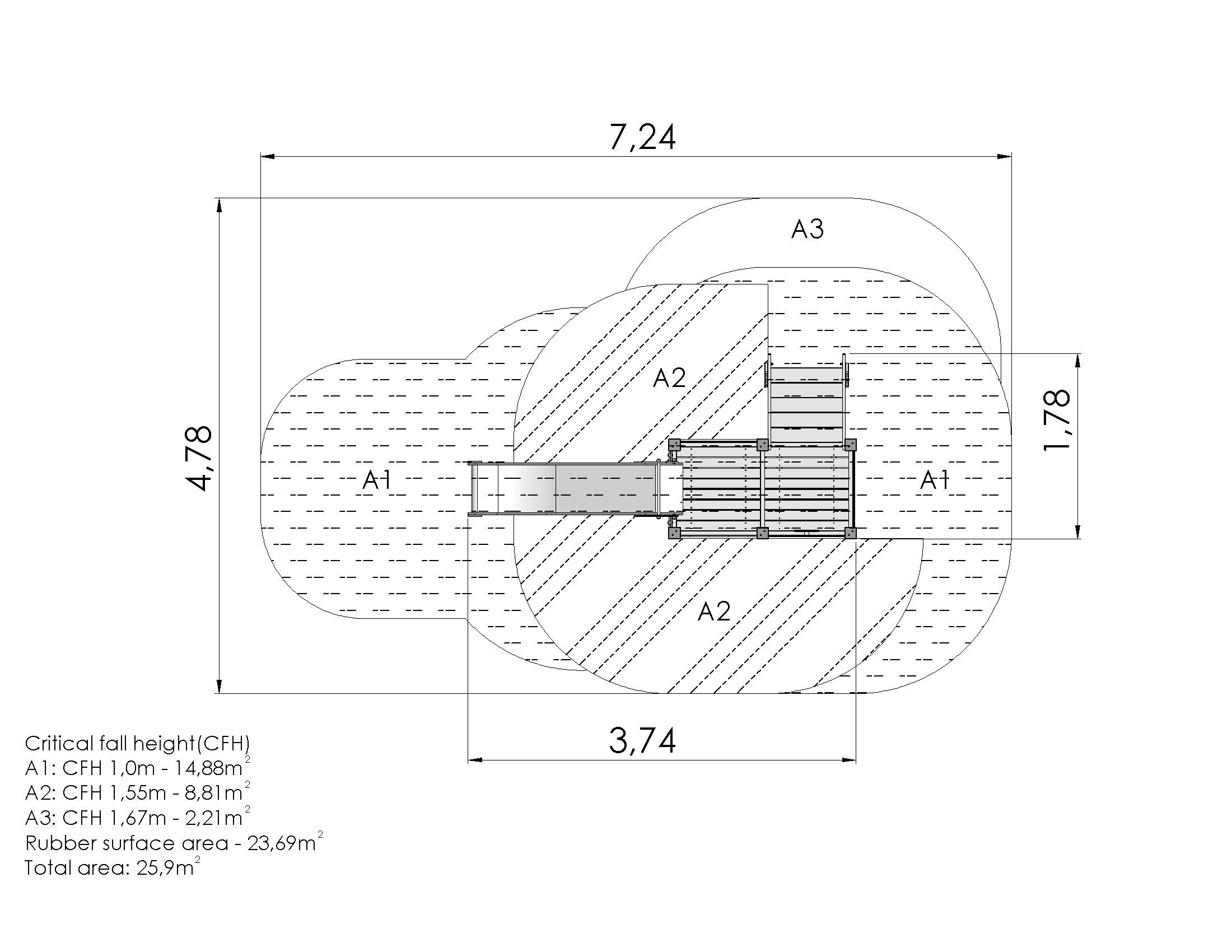 A slide with two platforms, a climbing wall, and stairs with handrails. The slide comes equipped with a captains helm and a play corner with a bench, which can be fitted with either kitchen or car dashboard elements. The side panels of the play centre can be switched for various activity walls or thematic printed panels (animals, birds, fish, trees, berries, etc.). The design of the panels will be finalised with the client during ordering.