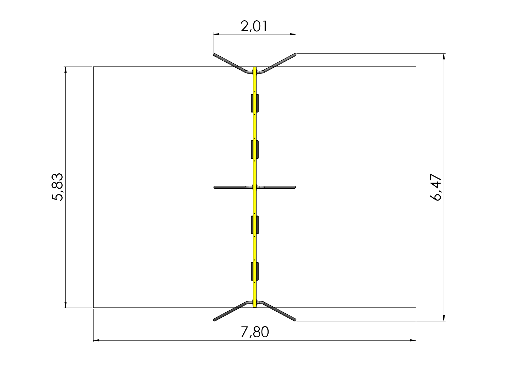 Double bay 4-seat freestanding hot-dipped galvanized swing frame EAGLE can be fitted with four cradle swing seats or regular swing seats. The 2-seat section can also be fitted with two tyre seats or one big and comfortable bird nest swing seat. Top rail of the EAGLE swing is powder-coated yellow.